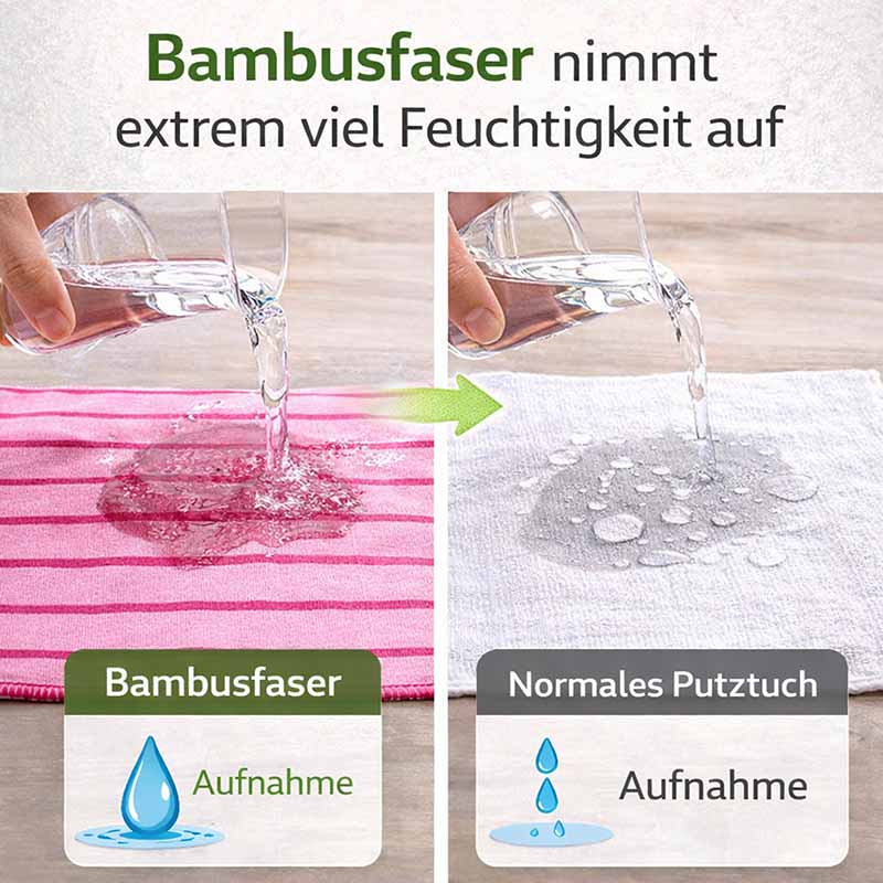 - Bambus Reinigungstücher mit hoher Saugkraft – die Bambusfaser nimmt besonders viel Flüssigkeit auf und sorgt für schnelles, streifenfreies Trocknen