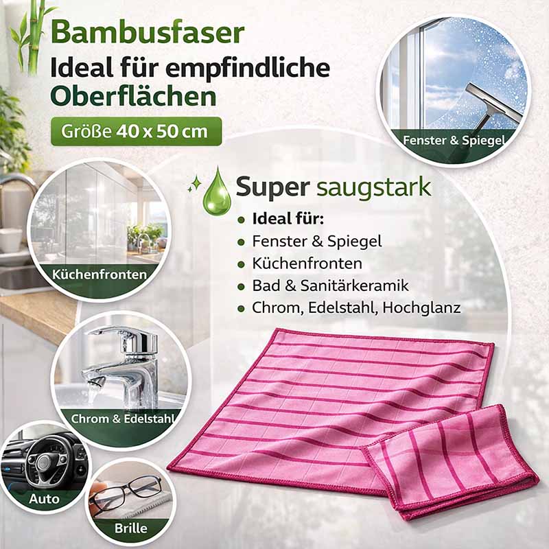 - Fusselfrei & materialschonend – die Bambus Mikrofaser hinterlässt keine Fusseln und keine Kratzer auf empfindlichen Oberflächen
