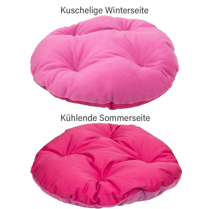 Das Einlegekissen hat 2 Funktions-Seiten, eine Winter-Seite mit einem wärmenden, weichen Fleece und eine kühlende Sommer-Seite. Beide Seiten sind extrem robust & strapazierfähig.