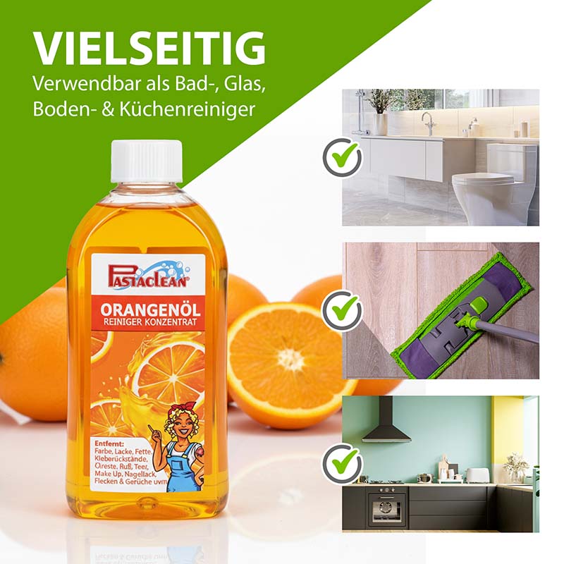 Das Pastaclean Orangenreiniger-Konzentrat bringt Glanz in Küche, Bad und Haushalt – mit der natürlichen Reinigungskraft der Orange. Aus 500 ml Konzentrat mischst du bis zu 25 Liter gebrauchsfertige Lösung und sagst selbst hartnäckigem Fett, Öl, Kleber, Etiketten, Harz, Kaugummi, Nikotin, Lack- & Make-up-Reste den Kampf an. Ob Herd, Dunstabzug, Fliesen, Fenster, Badkeramik oder Küchenschränke – dieser Alleskönner packt’s an und hinterlässt streifenfreie Sauberkeit mit frischem Orangen Duft.